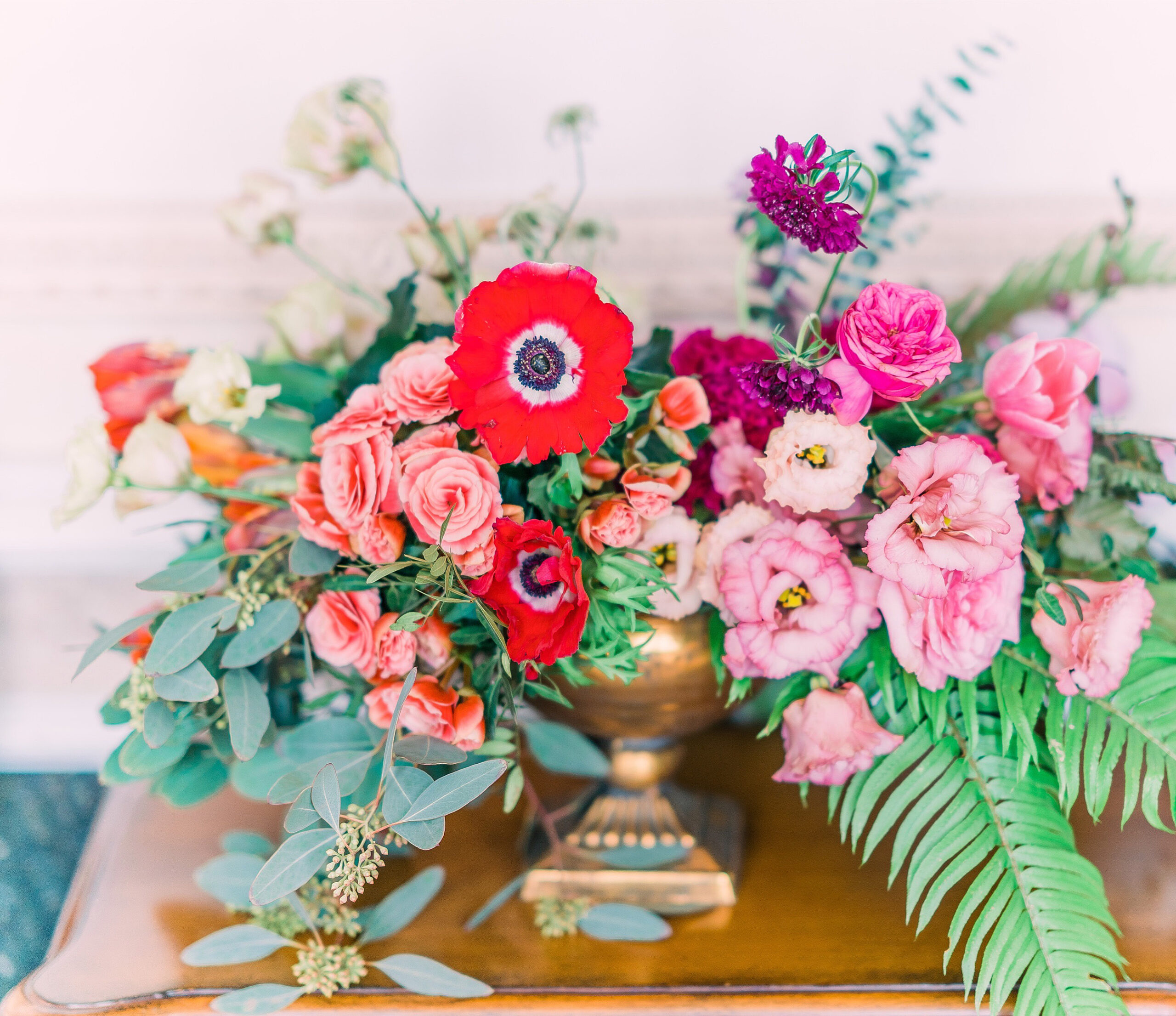 Contine flori delicate si suave: anemone, scabiosa, eustoma, double tulips, mini rosa, trandafiri, eucalyptus, feriga, germini.
