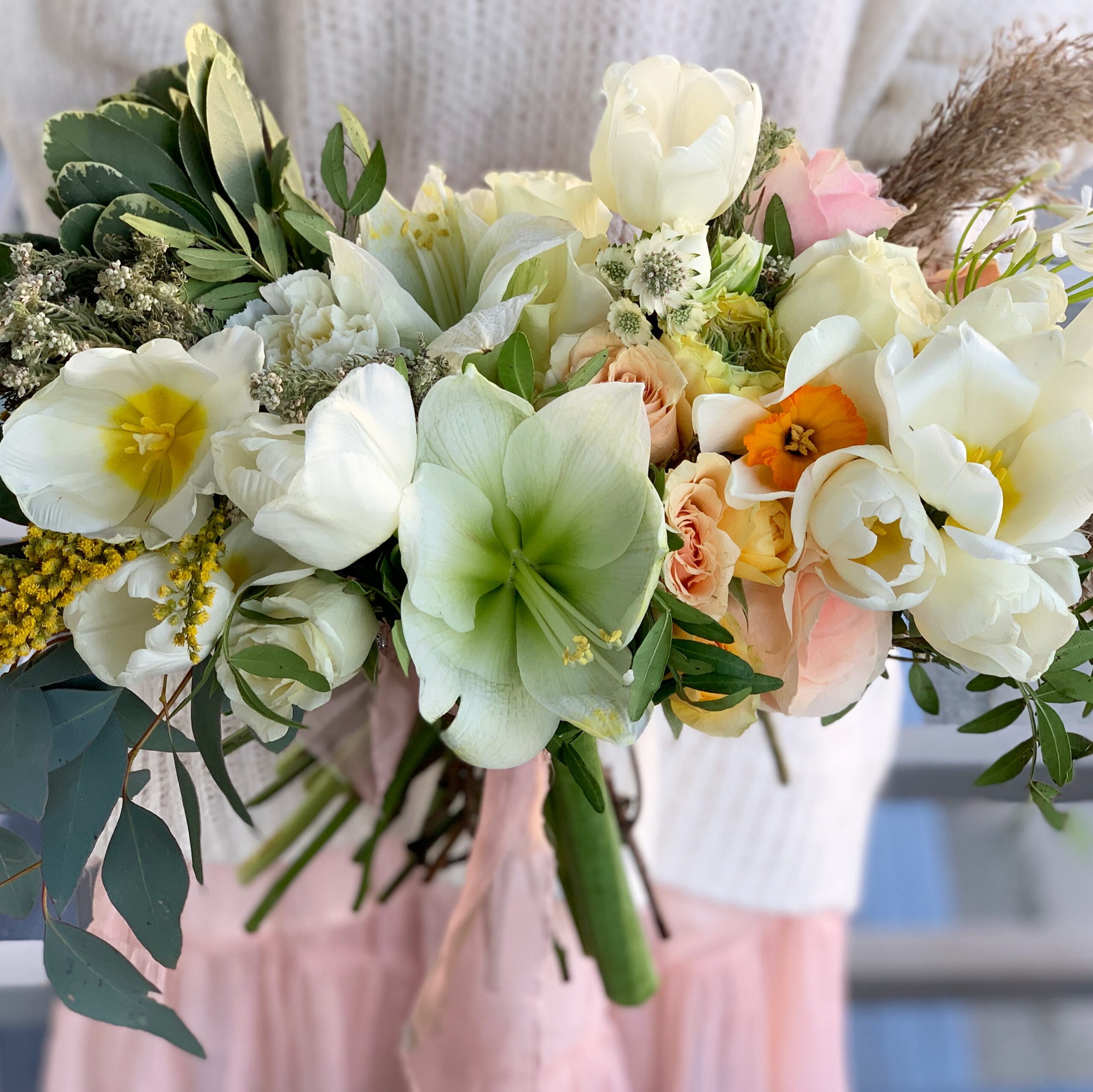 Buchet in nuante alb, ivoir, rose – pastel. Contine flori de primavara: lalele, eustoma, narcise, eucalipt, mini rosa, astrantia, trandafiri.