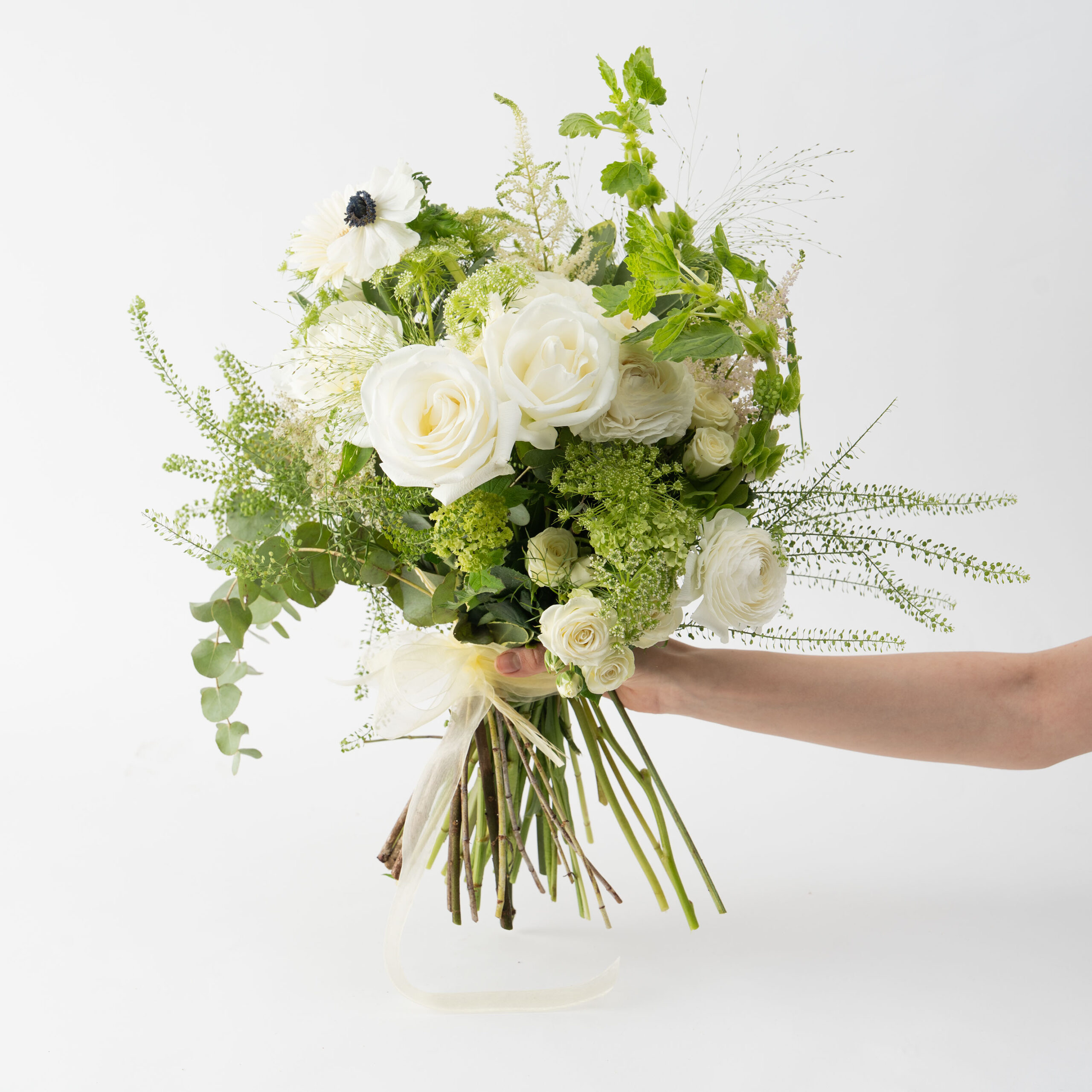 Un buchet care aduce aerul proaspăt al unui nou început. Tonurile de verde și alb împletesc liniștea naturii cu eleganța sincerității – o promisiune blândă de echilibru și reînnoire.