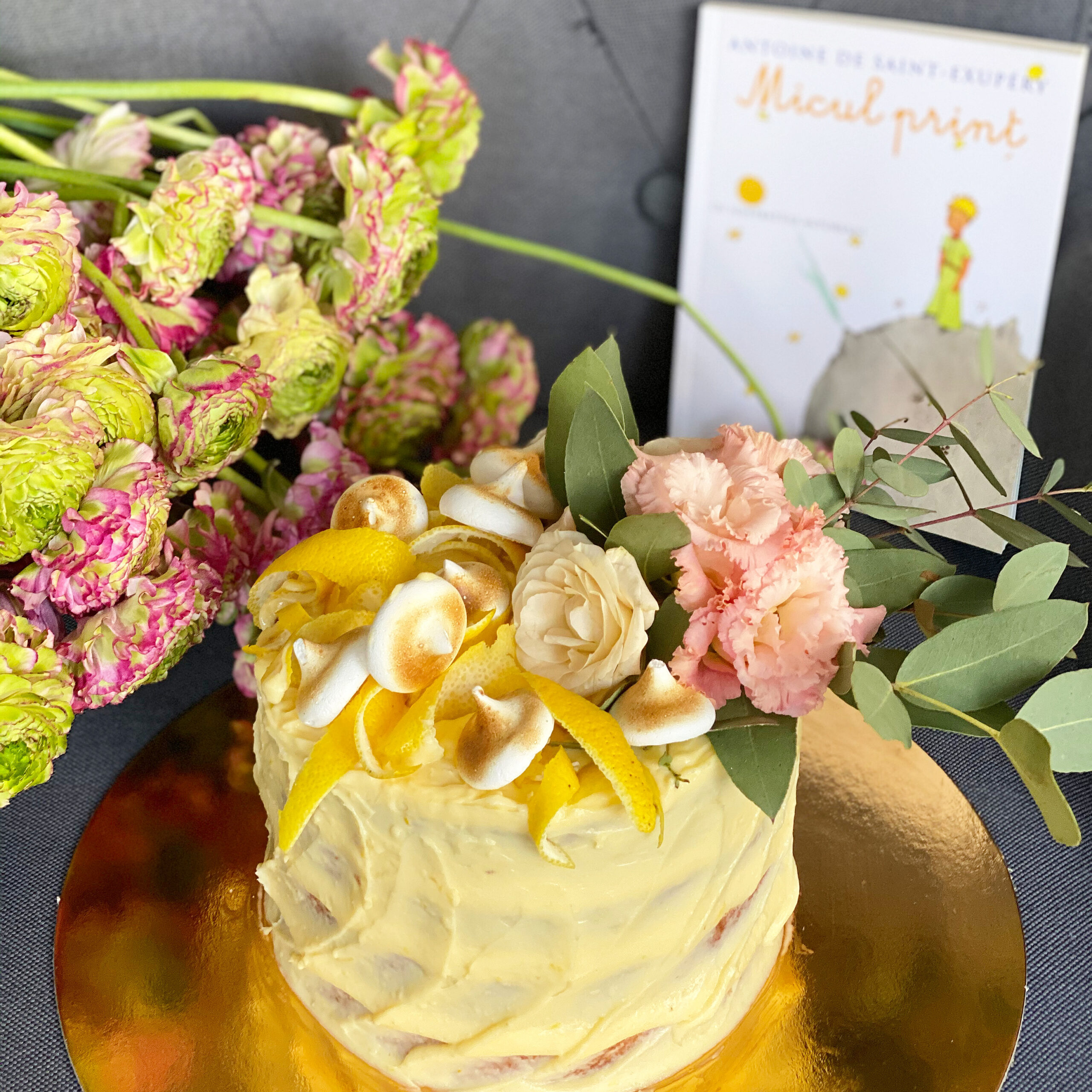 Cadoul contine un buchet delicat din flori, in tonuri pastelate, un tort „Limoncello” cu crema de lamaie si „parfum” de limoncello si cartea “Micul Print”