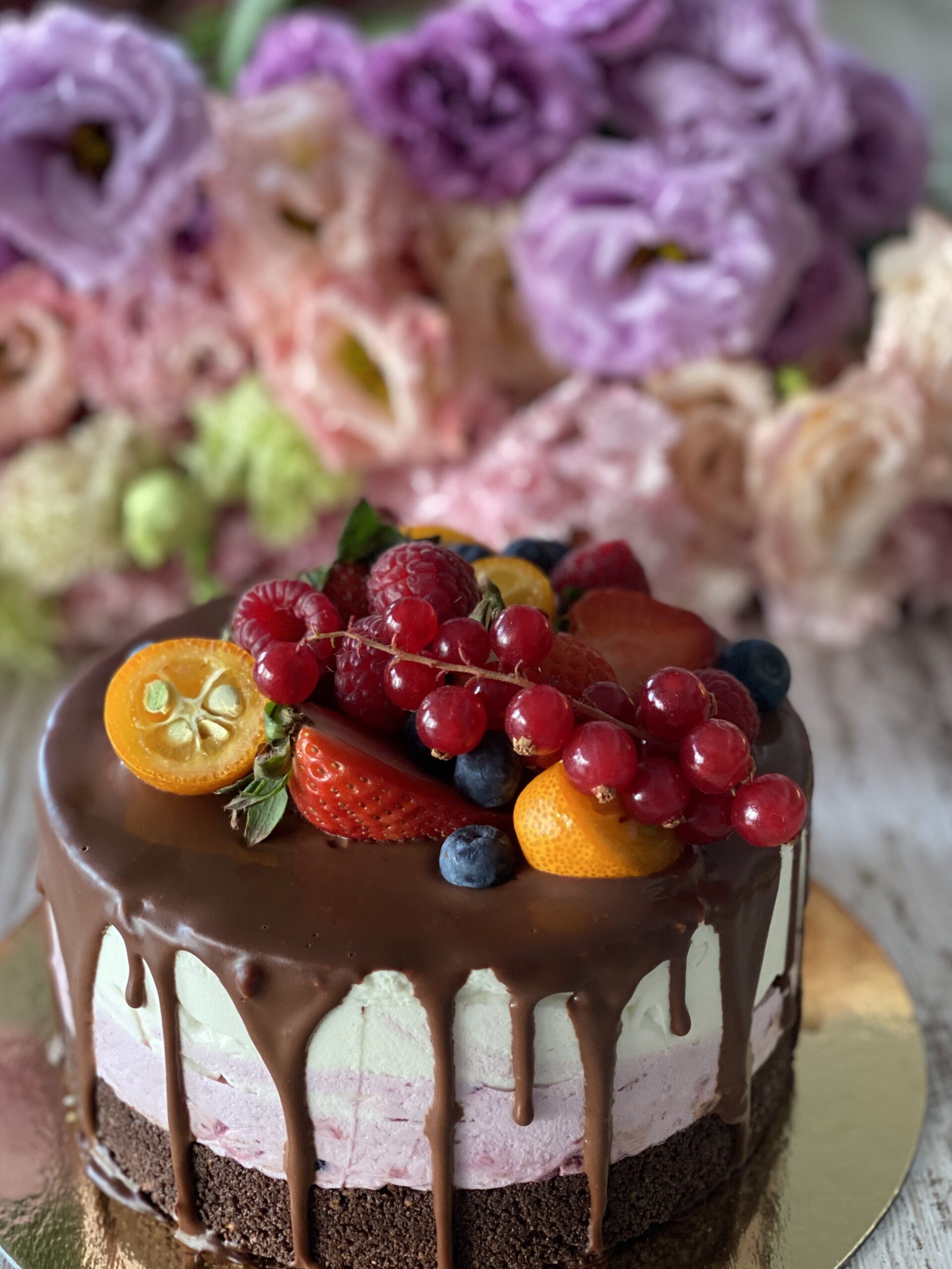 Cadoul contine un mini tort cu spuma de zmeura si ciocolata alba cu iaurt si un buchet delicat din flori in culoare calde, pastelate (eustoma sau flori de sezon)
