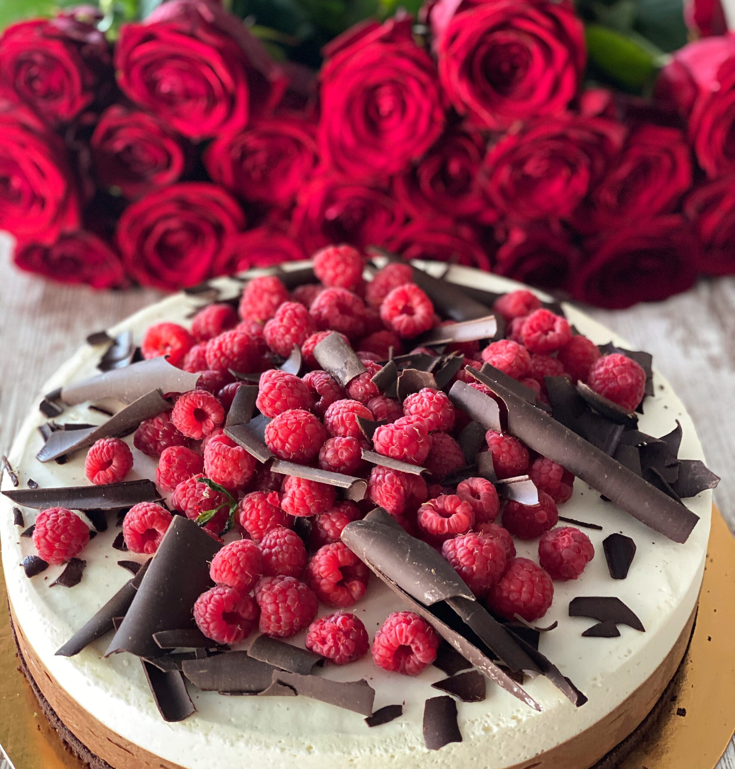 Duo Mousse cu ciocolata alba si neagra, extract de vanilie, decorat cu zmeura si fulgi de ciocolata, asezat pe un blat usor sfaramicios de biscuiti integrali.