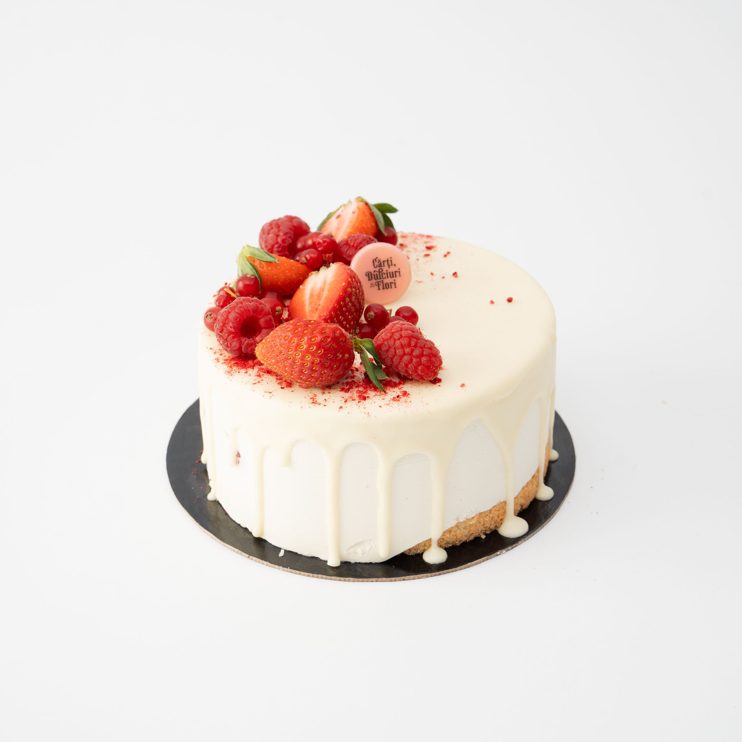 Mini mousse de ciocolata alba si visine in interior, extract de vanilie, glazurat cu ciocolata alba si fructe de padure, asezat pe un blat usor sfaramicios de biscuiti integrali.