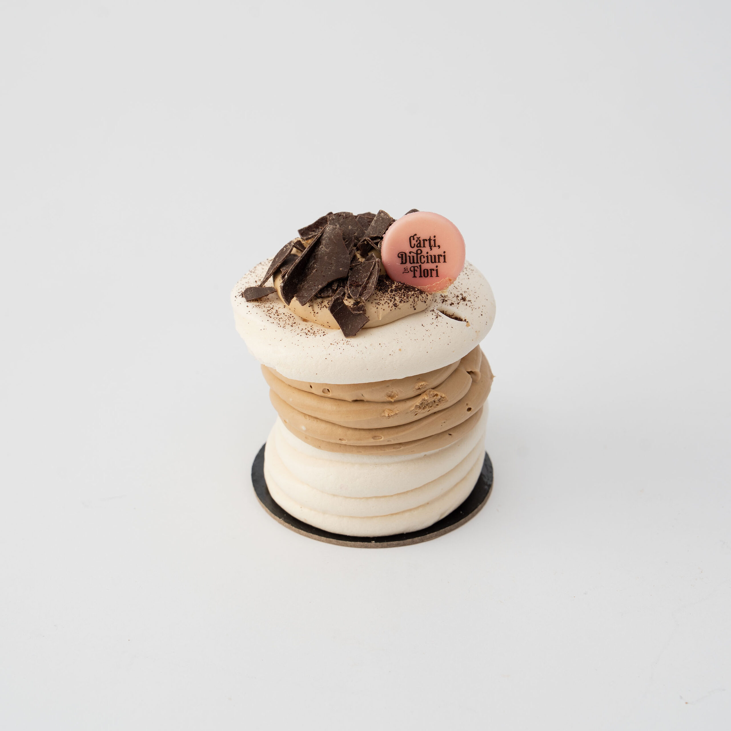 O monoporție rafinată de Pavlova cu cafea și vișine, bezea aerată și crocantă, ganaj fin cu ciocolată albă și o notă distinctă de cafea. Contrastul perfect este adus de sosul acrișor de