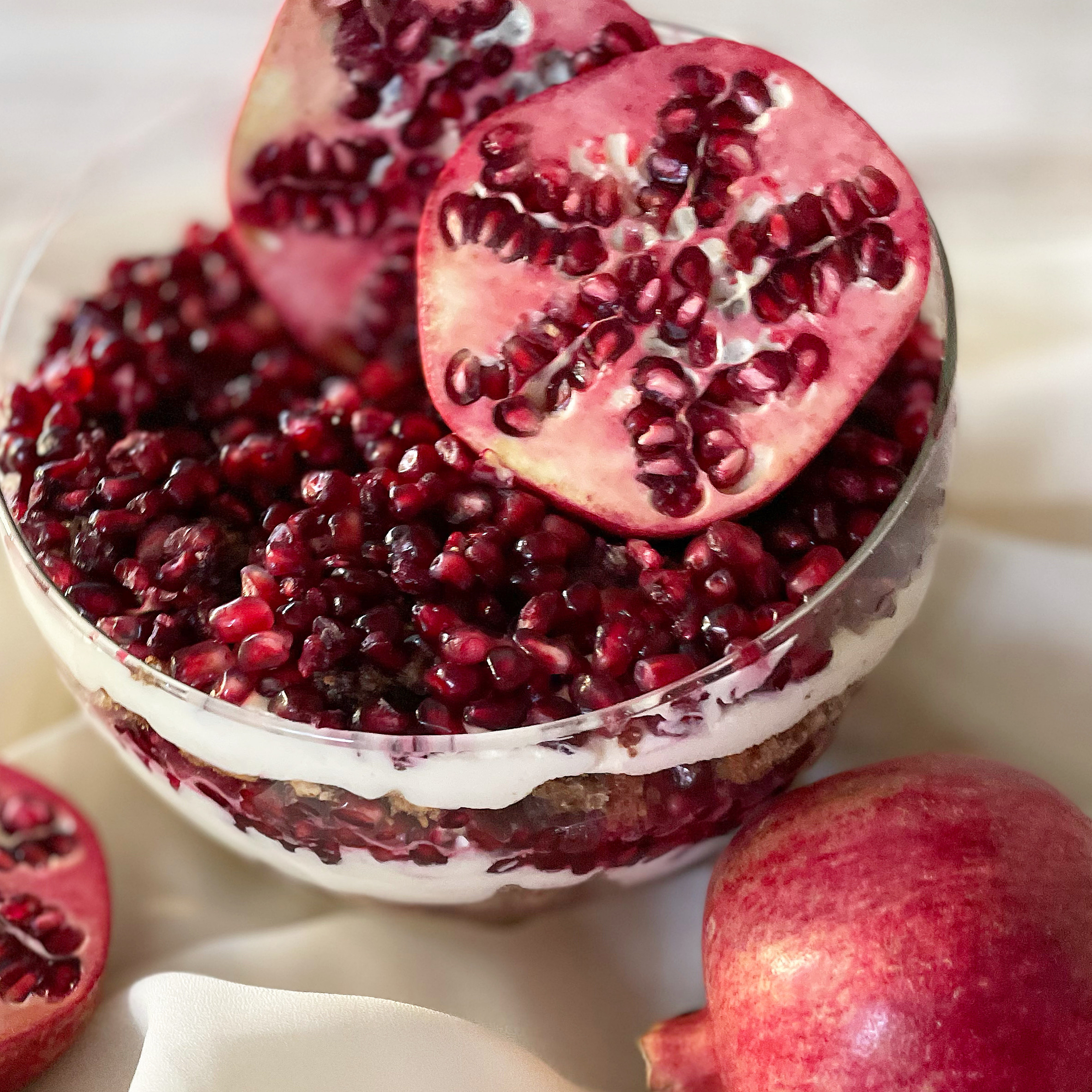 Blaturi cu o textura fina de pricomigdala, cu „parfum” de nuci rumenite, straturi de crema fina de mascarpone, rodie usor acrisoara si fulgi ciocolata amaruie, asezate in straturi intr-o cupa de sticla.