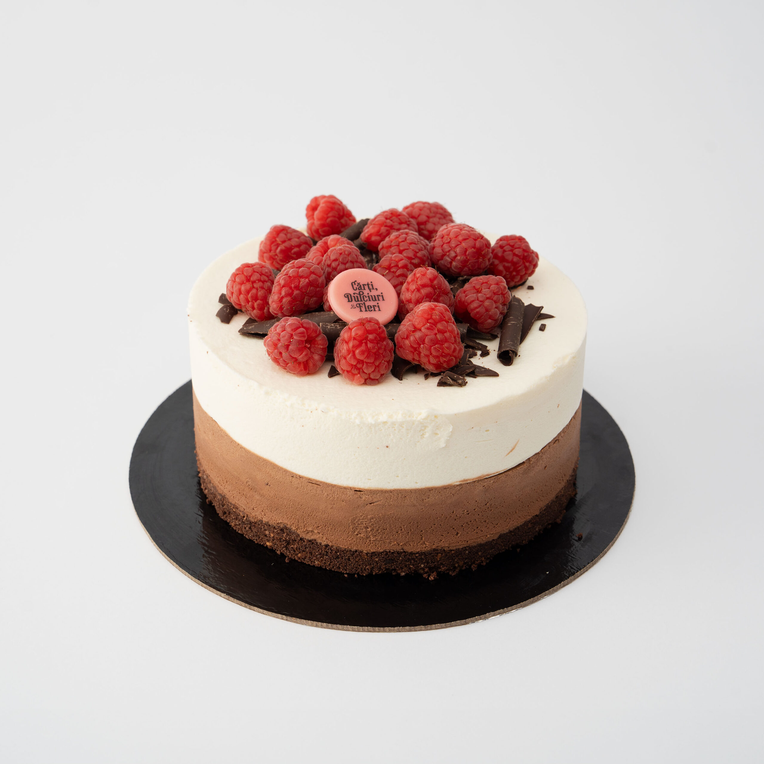 Mini Tort Duo Mousse de ciocolata belgiana, alba si neagra, asezat pe un blat usor sfaramicios de biscuiti integrali, decorat cu zmeura proaspata.